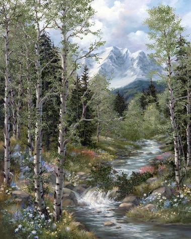 Spring flowers cascade down the hillside and along the banks of this little stream near Manitou Lake, with Pikes Peak in the background.